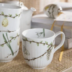 Mok met paasmotief uit de Hammershøi Easter-serie, geproduceerd door Kähler met een illustratie van Rikke Jacobsen. De mok heeft hetzelfde geribbelde oppervlak als de klassieke Hammershøi-serie, maar dan met een prachtig paasmotief dat het bijzonder lentegevoel vangt dat altijd rond Pasen de kop opsteekt. Combineer met de overige delen uit de Hammershøi Easter-collectie voor een complete look. Elk deel van het servies heeft een eigen, uniek motief dat een levendige tafelsetting creëert. De frisse lentetak, en de typische symbolen voor Pasen in de vorm van eieren, kuikens en veren, zijn een terugkomend element in de paascollectie van dit jaar,